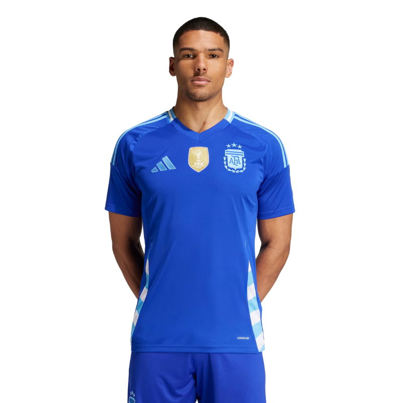 Luce los colores de Argentina en una camiseta visitante adidas inspirada en la escena musical nacional. Con elementos metálicos y un llamativo tono azul, esta camiseta está diseñada para mantener a los hinchas cómodos gracias a sus paneles de malla y tecnología de absorción AEROREADY. El escudo tejido del equipo es el protagonista mientras apoyas a tu selección en la cancha. Este producto está hecho con materiales 100% reciclados. Utilizando materiales reciclados disminuimos los residuos, nuestra dependencia de los recursos finitos y la huella que generan los productos que fabricamos.